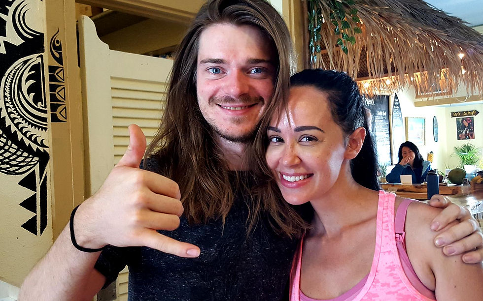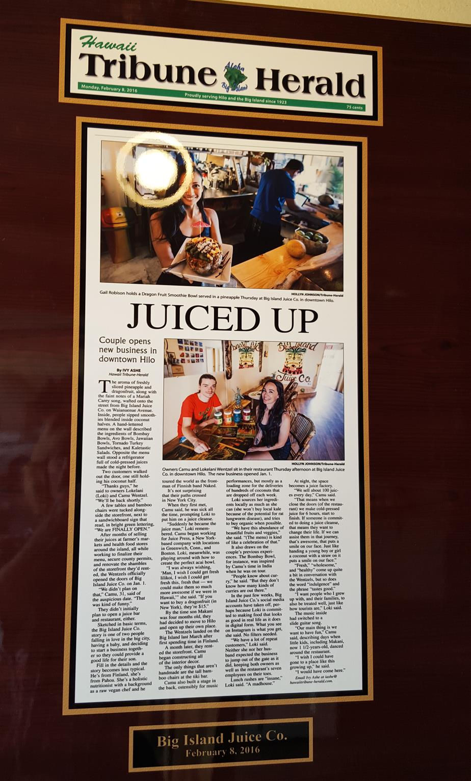 Shiny, happy people, Camu and Lokelani Wentzel, proud owners of Big Island Juice Company. Camu is originally from Finland. Lokelani is a Hawaii island girl from Pahoa. Together they have blended their talent for creating delicious tasting and holistic cuisine with their passion to build an honorable and successful legacy for their young son, Makani. You can tell that happiness and fun are also on the menu.